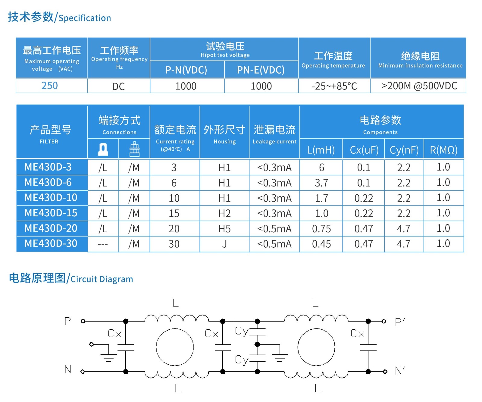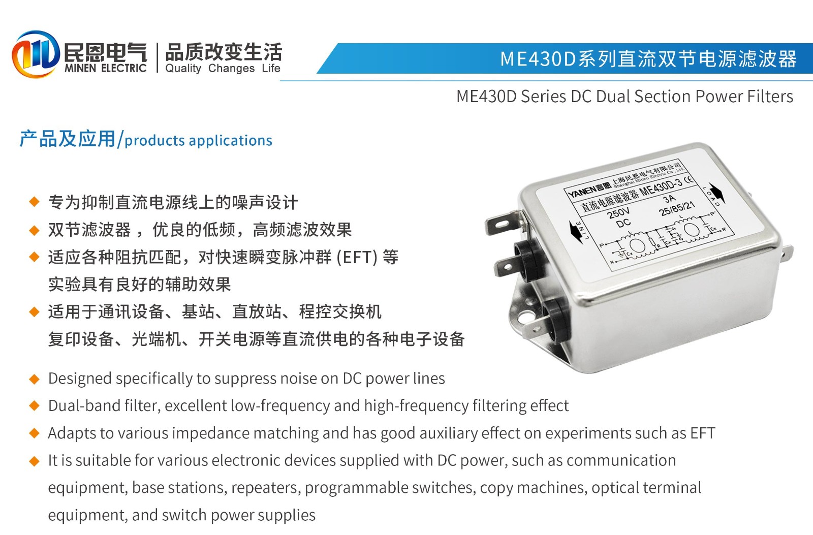 ME430D系列雙節(jié)直流電源濾波器