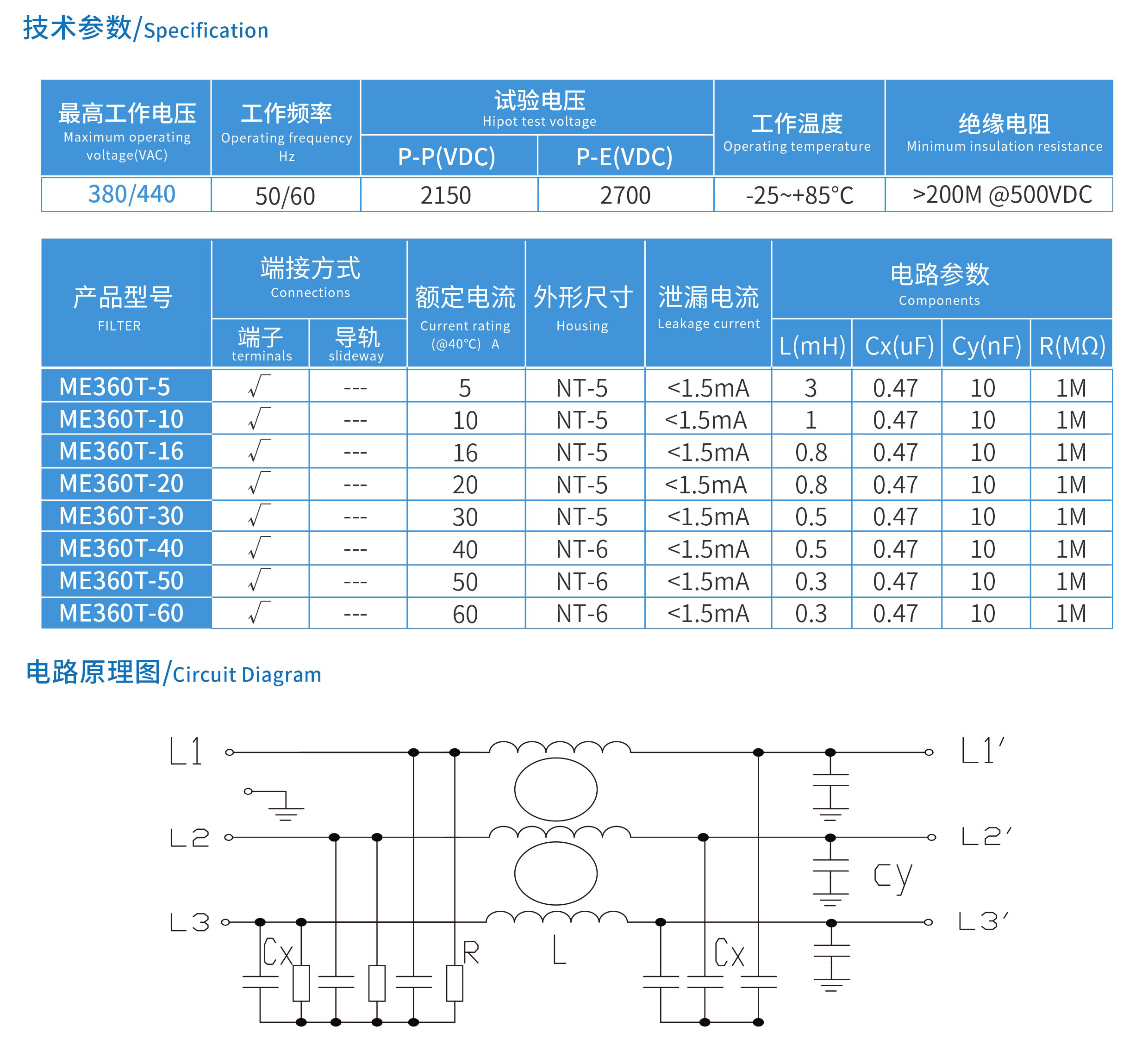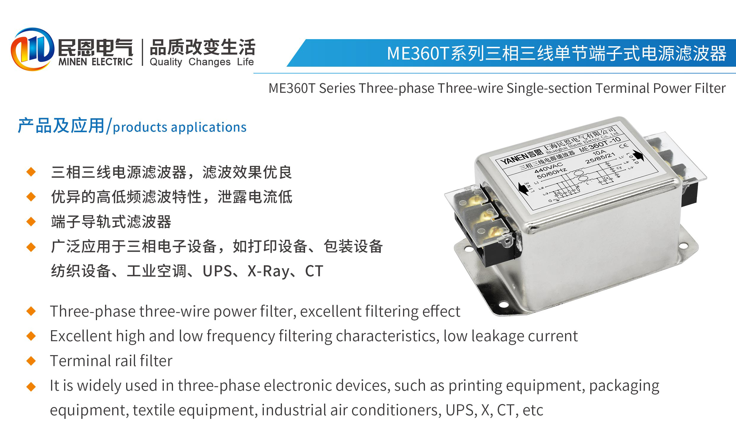 三相三線電源濾波器,濾波效果優(yōu)良,優(yōu)異的高低頻濾波特性,泄露電流低,端子導(dǎo)軌式濾波器
