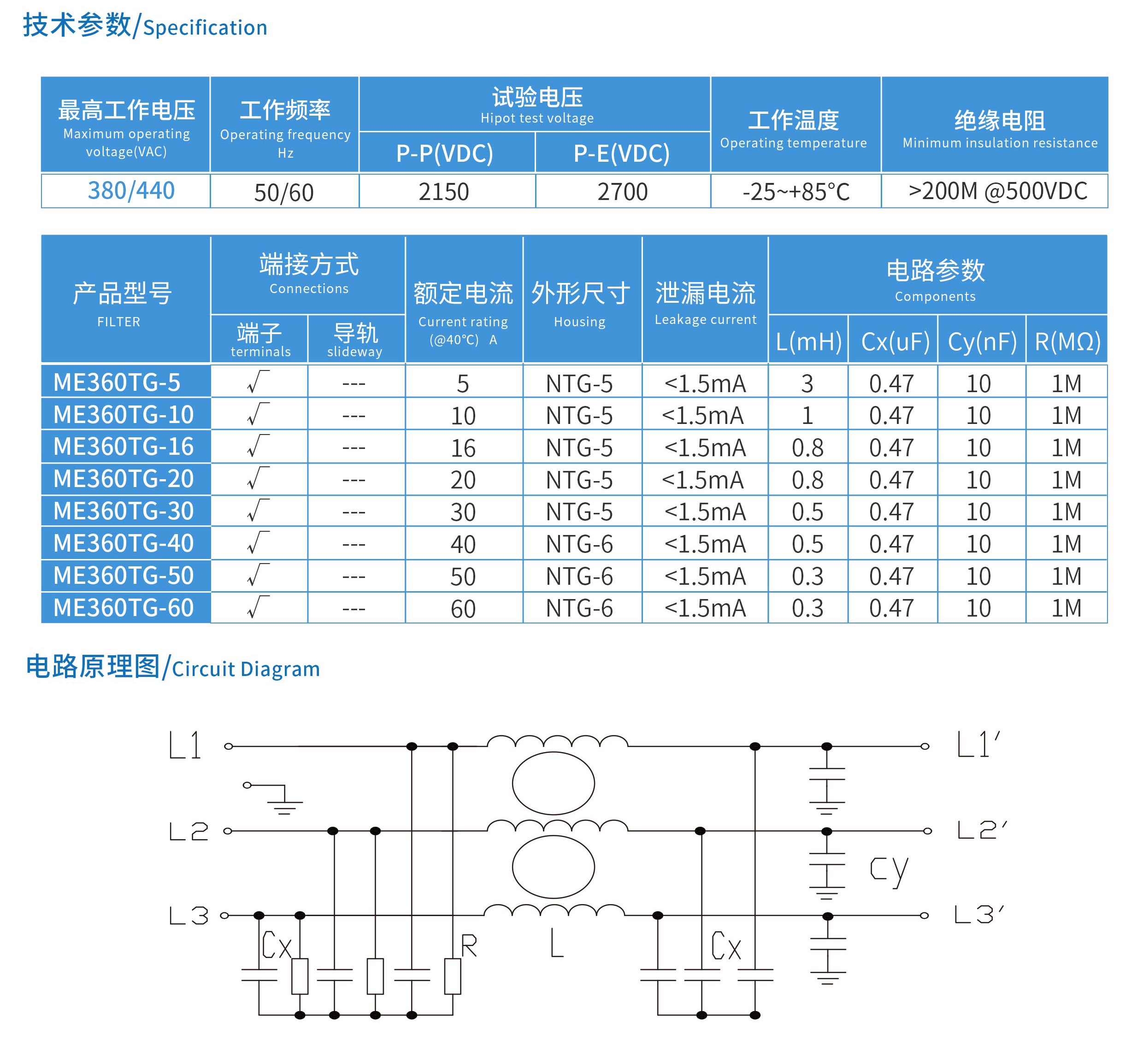 ME360TG系列導軌式三相三線電源濾波器