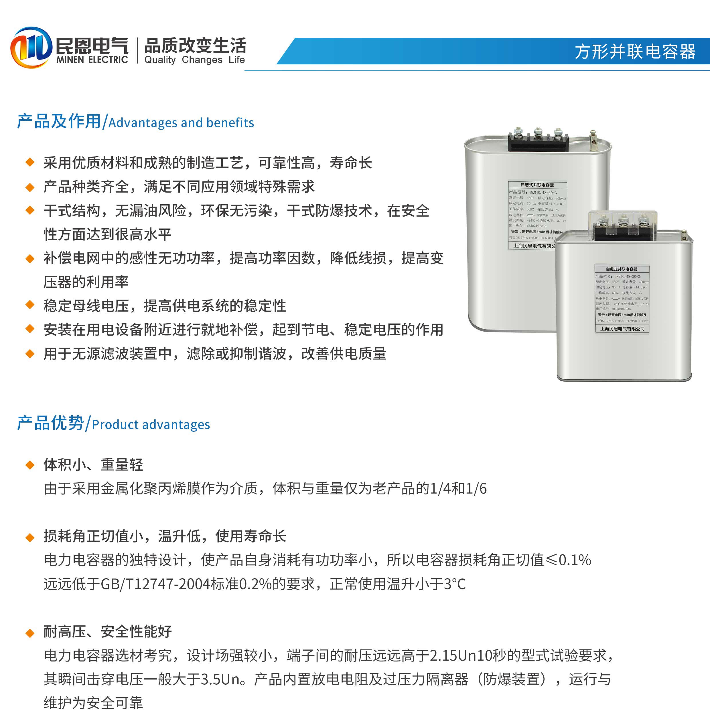 采用優(yōu)質(zhì)材料和成熟的制造工藝,可靠性高,壽命長,產(chǎn)品種類齊全,滿足不同應(yīng)用領(lǐng)域特殊需求,干式結(jié)構(gòu),無漏油風(fēng)險,環(huán)保無污染,干式防爆技術(shù)在安全性方面達到很高水平,補償電網(wǎng)中的感性無功功率,提高功率因數(shù),降低線損提高變壓器的利用率,穩(wěn)定母線電壓,提高供電系統(tǒng)的穩(wěn)定性,安裝在用電設(shè)備附近進行就地補償,起到節(jié)電、穩(wěn)定電壓的作用,用于無源濾波裝置中,濾除或抑制諧波,改善供電質(zhì)量